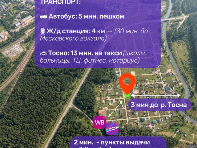Удобное транспортное сообщение. До автобусной остановки 5 минут пешком. Автобус идет до вокзала 10 мин., курсирует ежедневно. в 4 км от посёлка находится ж/д станция Саблино, до Московского вокзала 30 мин. на электричке. До г. Колпино 20 мин. Яндекс такси. До районного г. Тосно 13 км., где есть школы, дет. сады, бассейн Лазурный, фитнес-центры, торговые центры, салоны красоты, бизнес-центры, нотариусы, поликлиника, роддом, банки, рынок со свежими и натуральными овощами, фруктами и прочим продовольствием. -Недалеко от посёлка расположены Соляные пещеры, Саблинские водопады и конный клуб