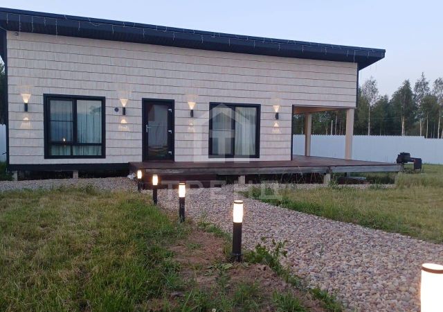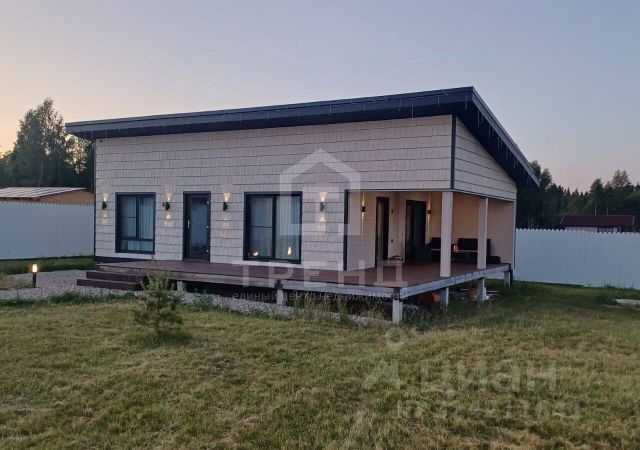 Дом построен из круглого бруса на ленточном фундаменте. Наружное утепление дома - пенопоулиретан (ППУ), сделана бетонная отмостка. Крыша металлочерепица, фасад дома из сайдинга. Во всех окнах дома стоят трехкамерные стеклопакеты.