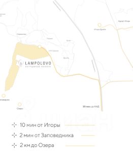 Участок находится в живописном коттеджном поселке бизнес-класса Lampolovo на границе с заповедником "Долина реки Смородинки", защищенной от вырубки и строительства на его территории новых жилых массивов, в 2 км от Смородинского озера, большого количества ручьев и крохотных лесных водопадов. В реке "Смородинке" водятся такие рыбы, как форель, щука и хариус.