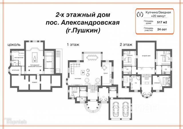 1 этаж: гардеробные, кабинет, с/у, гостиная, кухня, столовая, холл, 2 камина, гараж на 2 машины.