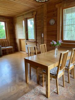 Дом 218 м.кв., 2009г, цилиндрованное бревно, фундамент - заливная плита, мягкая кровля. Функциональная планировка - кухня -гостиная - 65 кв.м. со вторым светом, 4 спальни- 19+19+17+11 кв.м, д2 санузла - 4,8 и 6,7 кв.м, хозяйственная комната 5,7 кв.м., котельная 6,1 кв.м , две террасы 18 и 13.5. Спальные комнаты оборудованы кондиционерами. Теплые полы. Дорогая качественная мебель. В кухне гостиной классический камин с живым огнем, в качестве топлива используют дрова. Достаточно места для проведения совместных мероприятий для детей и взрослых. Гостиная оборудована световым оборудованием для проведения дискотек. Из окон шикарный вид на озеро! И, самое главное, ..но это уже по телефону.