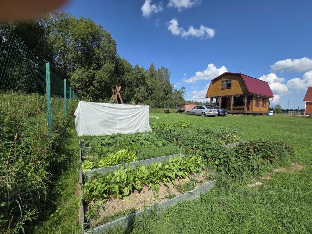 Участок ровный, огорожен забором. На участке посажены грядки с клубникой, есть малина, яблони, слива, крыжовник, смородина, цветы.
