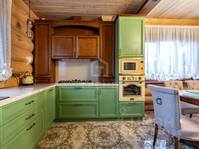 Этот трёхэтажный дом площадью 303 кв. м на монолитном фундаменте построен из бревна в 2016 году, сруб выдержан в естественных учловиях более 5 сезонов, что обеспечило равномерный процесс усушки бревна и усадки сруба. Снаружи бревно обработано высококачественной финской пропиткой Teknos, а изнутри - немецкой пропиткой Saicos.