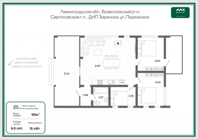 Локация: Дом находиться в охраняемом ДНП Заречное. Рядом расположены крупные центры - г. Сертолово и микрорайон Золотые Купола. В пешеходной доступности находится Комбатовское озеро, рядом пляжи пяти карьеров. На территории расположена оборудованная детско-спортивная площадка. При въезде в посёлок несколько магазинов, кафе. 5 минут на машине до Медного озера. В лесу неподалёку много ягод и грибов. Расположен в 12 км от КАД Санкт-Петербурга по Выборгскому шоссе.
