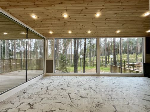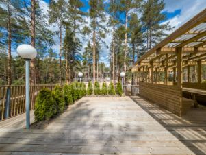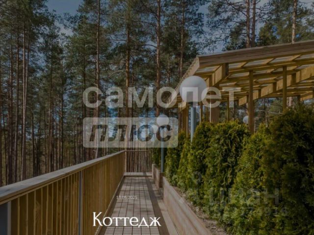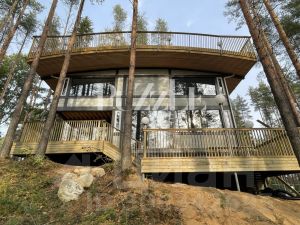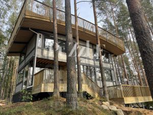 Участок расположен на возвышенности в окружении сосен, с крыши дома открывается прекрасный вид на кроны окружающих его деревьев.