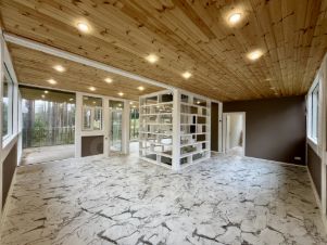 Большую часть 1 этажа занимает кухня-гостиная с панорамными окнами на три стороны света, с выходом на крытый балкон и открытую террасу. Здесь также находятся кабинет, гостевой санузел и хозяйственная кладовая/прачечная с входом прямо из кухни.
