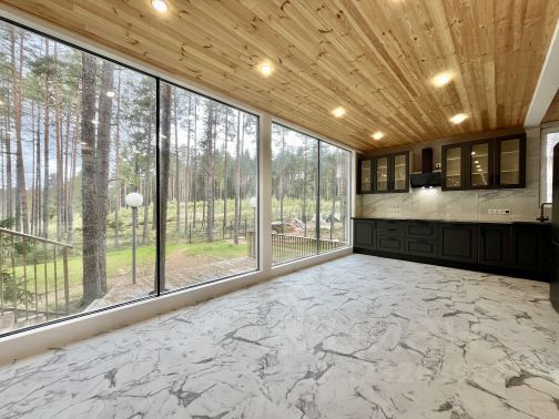Дом строится по технологии "фахверк" из клееного бруса. Для утепления используется теплоизоляционный материал PIR - огнестойкий материал, обладающий самой низкой теплопроводностью среди всех известных теплоизоляционных материалов. Панорамное остекление выполнено двухкамерными стеклопакетами толщиной 46 мм с теплоудерживающим покрытием.