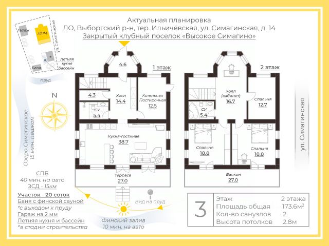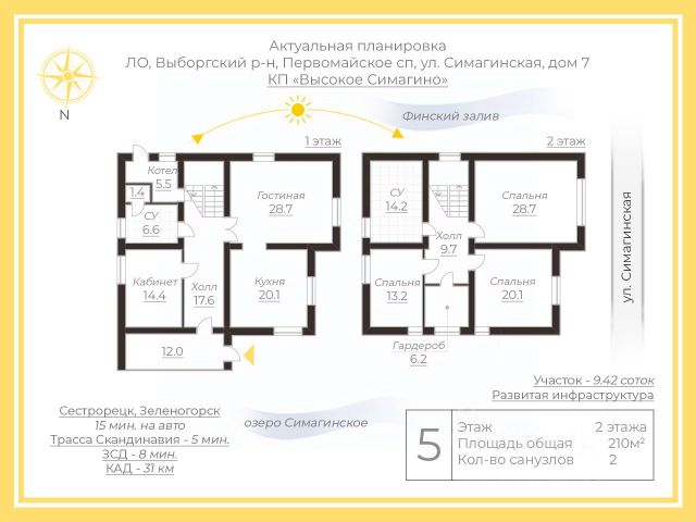 - Второй уровень: две спальни, гардероб, санузел с душевой и джакузи, кабинет, кухня с обеденной зоной, зал с камином, гостевой санузел.