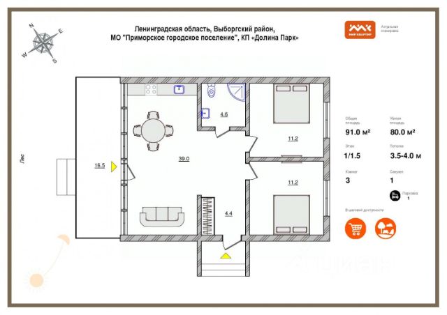 Ленинградская область, Выборгский район, поселок Поляны, КП Заячья Горка Земельный участок 15,47 соток, сухой, произведено межевание. Соседи рядом проживают постоянно, широкие дороги прямо до участка. Зимой чистят. Дом: Жилой каркасный дом общей площадью 141,9м2. с полной отделкой Соблюдены все стандарты и технологии строительства. + Фундамент -металлические винтовые сваи + Каркас из сухой строганной доски + Кровля металлочерепица, утепление 250мм + Панорамное остекление + Двухкамерные стеклопакеты + Стены утеплитель толщина 200мм + Пароизоляция, ветрозащита + Отопление эл. водяные полы Планировка: 1-й этаж: кухня/гостиная - 45,64м2, комната 1 - 13.24м2, комната 2 - 15.19м2 санузел - 7,72м2, прихожая - 3,9м2, терраса - 91,85м2 2-й этаж: комната 1 - 20,22м2, комната 2 - 20,22м2, санузел - 5,22м2, балкон - 17,94м2 На участке Баня с гриль зоной Коммуникации: + подведено электричество мощностью 10 кВт, договор с СНТ + вода - скважина + канализация - септик Инфраструктура: В поселке Поляны находящиеся в 10 минутах езды от КП школа, детский сад, сетевые магазины Магнит, Пятерочка. В КП пруд для купания и рыбалки, хвойный лес для прогулок и походов за грибами в шаговой доступности Как добраться: На авто 68 км от КАД по Выборгскому шоссе ж/д станция Каннельярви в 20 минутах езды от КП Объект без обременений, один взрослый собственник, более 5 лет в собственности, документы прошли юридическую проверку. Звоните, договоримся о просмотре. Номер объекта: #1/779687/82