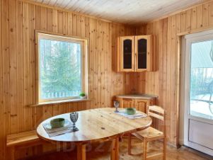 Дом, построенный из бруса, с внутренней отделкой из доски, ламинатом на полу и крышей из металлочерепицы, отличается надежностью и долговечностью. Фундамент сваи. Наружная отделка выполнена сайдингом. Отопление осуществляется печью-камином на дровах и электробатареями. Имеется баллонный газ.