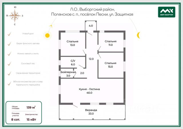 Наши преимущества: Развитая инфраструктура: рядом два ресторана, спа-центр, яхт-клуб, магазины. Собственные озёра для жителей посёлка — с прозрачной водой и песчаным пляжем. Всего 700 метров до берега Финского залива. Посёлок находится в окружении соснового леса и множества лесных озёр. 40 минут от ЗСД по идеальному асфальту. Уютный посёлок на 22 дома огорожен забором по периметру. Установлены камеры на въезде. Регулярно проводится уборка снега, покос травы и общий уход за территорией. Коммунальные услуги — 10 000 ₽ ежемесячно. Запишитесь на просмотр прямо сейчас! Если недоступен — пишите в сообщения Авито, и я Вам перезвоню. Описание: В прошлом году выполнена полная реконструкция с заменой всех элементов — от старого дома остались только фундамент и стены(сруб), которые утеплены эковатой и обшиты имитацией бруса. Внутренняя отделка выполнена качественными, натуральными материалами. Дом полностью готов к проживанию. Отопление: газовый котёл (сжиженный газ, ёмкость 4600 л), резервный электрический котёл. На 1 этаже — тёплые полы, на 2 этаже — радиаторы. Электричество — 15 кВт, в посёлке есть резервный дизель-генератор. Общепоселковый водопровод: три скважины, водонапорная башня, система фильтрации. Канализация — септик и поле рассеивания. Интернет — оптоволокно.