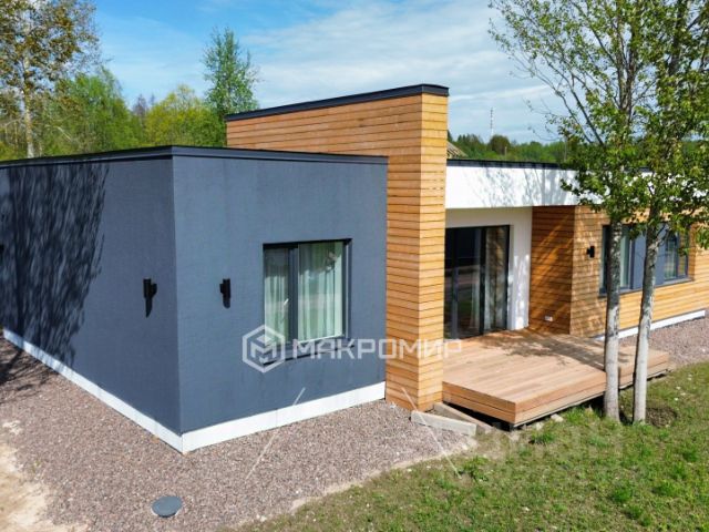Материал стен - утепление Rockwool, 275 мм. Фасад выполнен из термодревесины с имитацией клееного бруса.