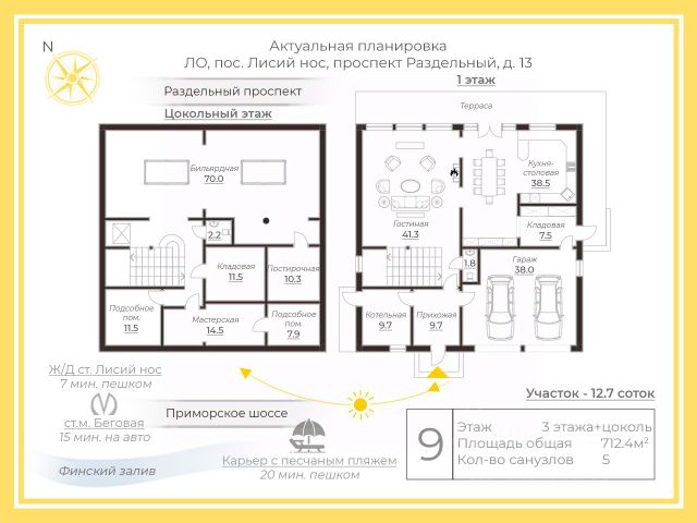 Арт. 104614333 Воплотите свои фантазии в жизнь в престижном посёлке Лисий Hoc! **Недвижимость, которая заслуживает внимания:** Уникальное предложение для тех, кто ценит комфорт и природу! В продаже дом общей площадью 550 кв.м., поюс подвал 128 кв м и гараж 38 кв мс участком 12.68 соток. Всего 15 минут от Санкт-Петербурга. **Дом вашей мечты:** Дом в престижном поселке Лисий Нос это воплощение вашей мечты о загородном рае, идеально сочетающем в себе спокойствие природного окружения и удобную транспортную доступность. Участок находится в ИЖС, что открывает широкие возможности для строительства дополнительных объектов, таких как баня, беседка для барбекю, бассейн или летняя кухня. Расположение участка выше уровня дороги и соседних участков неоспоримый плюс, обеспечивающий дополнительный уровень приватности и комфорта. Забор оборудован высококачественной ливневой системой, а по периметру дома функционирует эффективная дренажная система, что гарантирует защиту от подтопления. Все это обеспечивает максимальный комфорт и удобство проживания. Четырехэтажный дом (с учетом цокольного этажа и мансарды) построен по индивидуальному проекту и отличается высоким качеством строительства. Стены дома тщательно утеплены по всему периметру, обеспечат оптимальный микроклимат внутри помещения независимо от времени года. Внутри вас ждет продуманная планировка, включающая в себя: * **Цокольный этаж:** Просторная бильярдная, удобная мастерская для реализации ваших хобби, вместительная кладовая, практичная прачечная, санузел и два подсобных помещения, обеспечивающие дополнительное пространство для хранения. * **Первый этаж:** Просторная гостиная, идеально подходящая для семейных вечеров и приема гостей, уютная столовая, современная кухня, кладовая, котельная и санузел. Для вашего удобства предусмотрен гараж на два машино-места. * **Второй этаж:** Четыре комфортабельные спальни, гардеробная комната для хранения одежды и аксессуаров, а также два санузла, что обеспечивает максимальный комфорт для всех членов семьи. **Инженерные коммуникации:** Дом обеспечен всеми необходимыми коммуникациями: центральный газ подведен и ожидает подключения, электроэнергия также подведена и готова к подключению, функционирует канализация. Для вашего удобства, к воротам подведено электричество для автоматического открытия ворот с ключа, ожидающего подключения. **Уникальное местоположение:** Дом расположен в престижном поселке Лисий Нос на берегу Финского залива, всего в 7 минутах езды от КАД и в 10 минутах ходьбы от ж/д станции Лисий Нос. До станции метро "Беговая" можно добраться всего за 15 минут на автомобиле. Удобные выезды на ЗСД и КАД обеспечивают отличную транспортную доступность. В поселке развита инфраструктура: магазины, кафе, магазин фермерских продуктов, школа, детский сад, теннисный клуб РМI SРОRТ с закрытыми грунтовыми кортами, пляж "Морские дубки", Владимирская церковь и поликлиника 63. Близость к природе, живописные пейзажи Финского залива и пляжи все это создает неповторимую атмосферу спокойствия и умиротворения. **Выгодные условия сделки:** * Один взрослый собственник. * Никто не прописан. * Вся цена отражена в договоре. * Быстрый выход на сделку. **Ключевые преимущества:** * Уникальное расположение в элитном поселке Лисий Нос на берегу Финского залива. * Просторный дом 712.4 кв