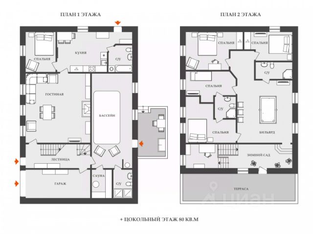 — Дом двухэтажный, + цоколь, + гараж, + бассейн и сауна.