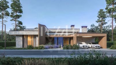 - Особенности: 2 спальни со своими гардеробными и с/у, кабинет (15 м2), кладовая на кухне, панорамное остекление, навес на 2 авто.