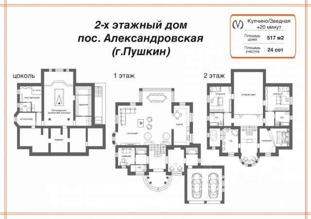 1 этаж: гардеробные, кабинет, с/у, гостиная, кухня, столовая, холл, 2 камина, гараж на 2 машины.