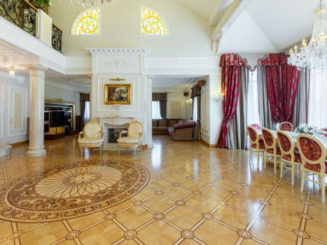 Стены - венецианская штукатурка из Италии и экологичные обои из Франции. Полы - наборный художественные паркет и итальянская плитка. Потолки от 3 до 8 м. В гостиной великолепный второй свет. Двери - массив с инкрустацией, из Италии.