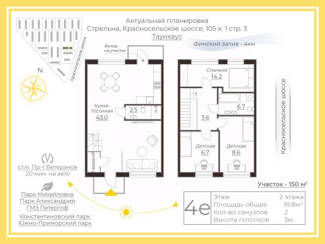 Просторный 2-х этажный таунхаус с собственным участком и двумя парковочными местами в Петродворцовом районе в ЖК "Алгоритм Стрельна"! ID899 (20.4) У нас можно дозаказать качественную недорогую отделку под ключ!!! Общая информация: - Ключи получены - Один взрослый собственник - Городская прописка! - Возможна покупка в ипотеку Преимущества работы с нами: - Окажем юридическое сопровождение сделки - Одобрим ипотеку - Продадим Вашу квартиру или дом безопасно и быстро. Бесплатная оценка - Специализируемся на инвестициях в недвижимость: поможем выгодно вложить деньги в СПб и Крыму с целью перепродажи или сдачи в аренду. Свой филиал в Крыму. Удалённые сделки. Полное сопровождение. - Готовы работать с агентами, приводите покупателей! Добавляйте в избранное, чтобы не потерять! Параметры объекта: - Сквозная планировка с главным входом и выходом на собственный участок - Увеличенные окна на 2 стороны - Участок (зеленый двор) выходит на восточную сторону - Высота потолков 3,1 м. - Первый этаж: Просторная кухня-гостиная 28,41 м. для встречи с самыми близкими Спальня 9,66 м. Есть возможность установить камин Совмещенный санузел - Второй этаж: 2 спальни 15,59 м. и 12,75 м. Раздельный санузел Инфраструктура и транспортная доступность: - Вся инфраструктура комплекса доступна только жильцам - Закрытая территория с круглосуточной охраной и видеонаблюдением - Собственный парк с фонтанами, прогулочными аллеями и центральной площадью - Во дворе-парке выполнен ландшафтный дизайн, живые изгороди, множество газонов и взрослых деревьев, организованы места для отдыха - Установлены 2 спортивные площадки, оборудованные уличными тренажерами, детские площадки - В 15 минутах езды Петергоф с его парками и фонтанами - Шунгеровский лесопарк находится в 10 минутах пешком, Константиновский парк и Финский залив - в 10 минутах транспортом - Ж/д станция "Сергиево" в 15 минутах пешком, КАД находится в 5 минутах транспортом, так что время в пути до центра города составит всего 30 минут Звоните! Наши специалисты готовы в любой день показать Вам таунхаус! Загородная недвижимость на шоссе Красносельское в поселке Стрельна в Санкт-Петербурге.