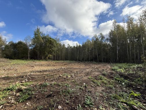 прямоугольный участок, неразработанный. Подведено электричество, есть возможность подключиться к газу. Рядом хвойный лес.