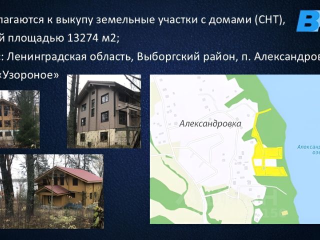 Предлагаю к выкупу земельные участки с домами (Снт), общей площадью 13274 м2; расположенные в живописном месте Выборгского района Ленинградской области, на берегу озера Александровское. Договор купли-продажи заключается по результатам реализации имущества, в рамках процедуры банкротства собственника, юридического лица ООО леноблспецстрой.
