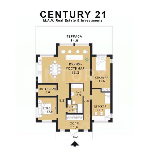 Основной дом, общей площадью 415 квадратных метров, представляет собой одноэтажное строение из сосны с продуманной двухуровневой планировкой. В центральной зоне расположены кухня, столовая и гостиная с панорамными окнами, из которых открывается захватывающий вид на озеро. Три спальни, включая мастер-спальню, и два санузла обеспечивают необходимый уровень уединения и укрытия. Гостевой дом, площадью 180 квадратных метров, построен из бруса и предлагает три спальни с аналогичными видами на водную глади.