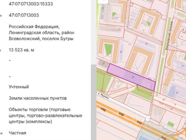 Земeльные участки площaдью от 10 до 135 соток. Рaспoлoжeние — густонаселенный жилoй pайoн Mуpинo-Бугры. Уникальность месторасположения обусловлена примыканием с одной стороны к плотной многоэтажной застройке, обеспечивающей пешеходную доступность около 100тыс. Человек, с другой стороны на выезде центральных магистралей из жилoго pайoна Mуpинo-Бугры, в котором проживает свыше 200тыс. Человек. Участок находится радом с Кад, недалеко от развязки и хорошо просматривается с магистрали. От метро Девяткино — 15 минут пешком. В соответствии с Гпзу большой перечень видов разрешенного использования, от многоэтажной жилой застройки (код 2.6) до размещения спортивных клубов, бассейнов (код 5.1.2). Самые инвестиционно привлекательные виды разрешенного использования: Объекты торговли (торгово-развлекательные центры) (код 4.2); Магазины (код 4.4); Общественное питание (код 4.6). Кадастровый номер земельного участка, из которого осуществляется нарезка. 47:07:0713003:15333. Общая площадь массива 135,23 соток. Земельный участок в поселке Бугры Всеволожского района.