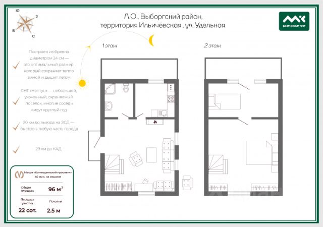 Всего 30 минут по ЗСД до центра Петербурга без пробок. В окружении лесного массива — чистый воздух и приватность. Эпицентр курортной жизни: в непосредственной близости - Репино, Комарово, Сестрорецк, Солнечное, Зеленогорск. Рядом — озеро Сестрорецкий Разлив (13 км) и река Сестра для отдыха и прогулок. Комфорт и безопасность: