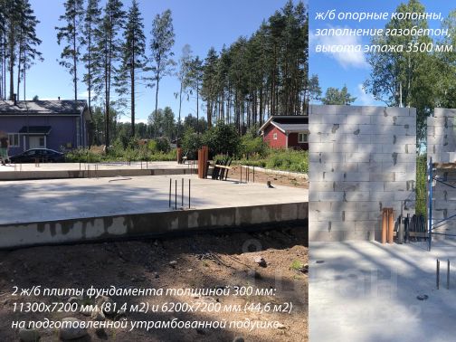 Разработан концептуальный проект строительства двух отдельных жилых зданий с монолитным фундаментом (плиты), газобетонными стенами и монолитными подпорными столбами, панорамным остеклением, большой деревянной верандой вокруг и между зданий. Возведены: плиты фундамента, газоблочные и монолитные стеновые конструкции первых этажей для двух домов. Под фундаментом организованы закладные гильзы под инженерные коммуникации (водоснабжение, силовые и слаботочные линии, водоотведение, резервные вводы). Завершение строительства возможно с несколькими сценариями этажности, кровли, внешней отделки, количеством и назначением жилых помещений). Со второго этажа зданий открывается панорамный вид на нижнюю террасу поселка и залив.