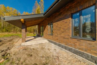 Дом построен из круглого бруса на ленточном фундаменте. Наружное утепление дома - пенопоулиретан (ППУ), сделана бетонная отмостка. Крыша металлочерепица, фасад дома из сайдинга. Во всех окнах дома стоят трехкамерные стеклопакеты.