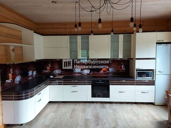 Кухня (обшивка вагонкой) длинна 3,9 м., ширина 2,3 м.: окно, металлическая печь с кирпичным тепловым щитом (которая не только отапливает дом, но и на которой можно замечательно готовить), обеденный стол, электроплитка, рукомойник и лестница на второй этаж.