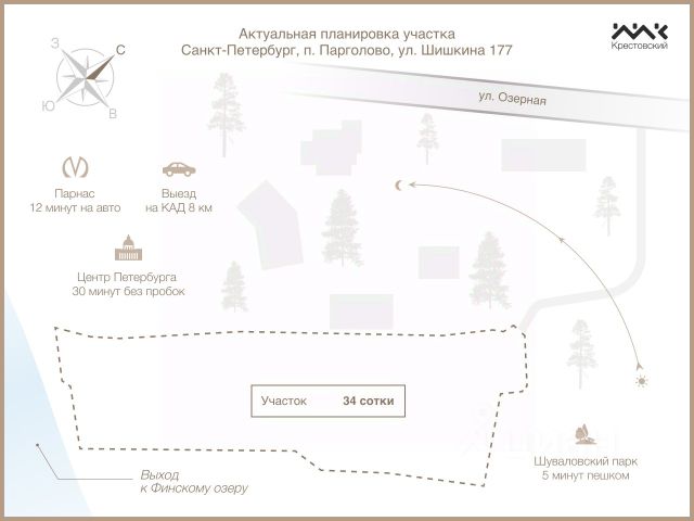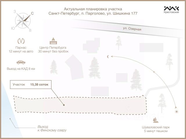 Арт. 114853865 Уникальный видовой участок у воды в Парголово. Собственный выход к Финскому озеру дарит редкое ощущение пространства и свободы — это то место, где всегда хочется задержаться подольше. Участок ИЖС 18,7 соток с Петербургской пропиской. Рядом лес, парк и вся необходимая инфраструктура. До метро "Озерки" — 12 минут на автомобиле, поблизости есть магазины, школы, детские сады и поликлиники, недалеко расположена остановка автобуса. До центра города всего 35 минут. В этом направлении пробок нет — стабильное время в пути в любое время дня. Участок прямоугольной формы на лёгком возвышении с видом на озеро — удачная посадка дома обеспечит и приватность, и красивый вид из окна. На участке растут яблони, малина и много зелени. Подведено электричество и газ. Есть точка подключения к городскому водопроводу, можно планировать строительство без длительных согласований. Ровный асфальтированный подъезд обеспечивает комфорт круглый год, соседи доброжелательные. Застройки на участке нет — чистое поле для индивидуального проекта. Звоните, чтобы узнать детали и договориться о просмотре!