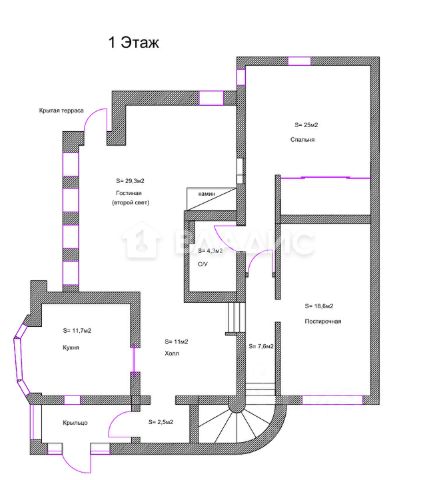 1 этаж: гардеробные, кабинет, с/у, гостиная, кухня, столовая, холл, 2 камина, гараж на 2 машины.