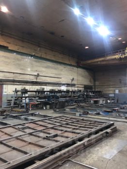 Высота помещений на первом этаже от 10 до 13 метров. Въездные ворота -1 шт., размер 4,5 (м) на 4,4 (м). Полы бетонные. Есть три крана 15 тонн, 20 тонн, 30 тонн. На планировке указано размещение кранового оборудования. Есть покрасочная камера. Помещение оборудовано раздевалками и сан. узлами.
