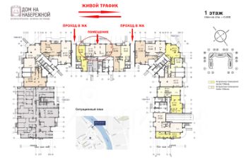 Помещение прямо по центру большого ЖК. Объект находится на трафике, между двумя основными проходами в жилой комплекс.