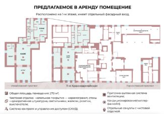 • Универсальное помещение: 270 м², идеально подходящее для организации ритейла или кафе.