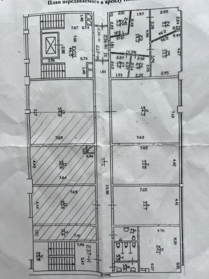 Свободные помещения выделены на планировке. Общая площадь свободных помещений около 136 кв.м. (полезная площадь 105 кв.м., общая площадь 31 кв.м.).