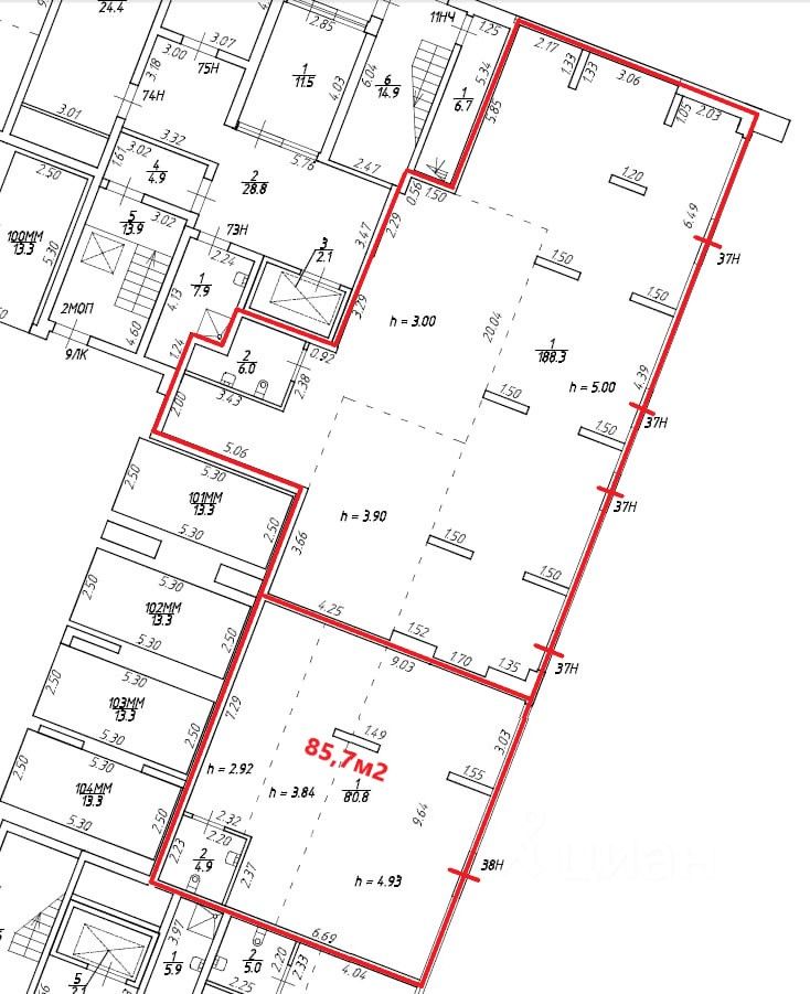 Высота потолка 2,9-3,7 м.
