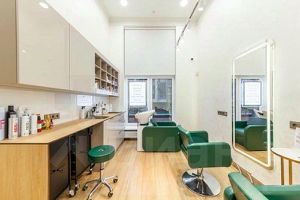 встроенный шкаф при входе, ресепшн, лаборатории в каждом кабинете, зеркала в парикмахерском зале.