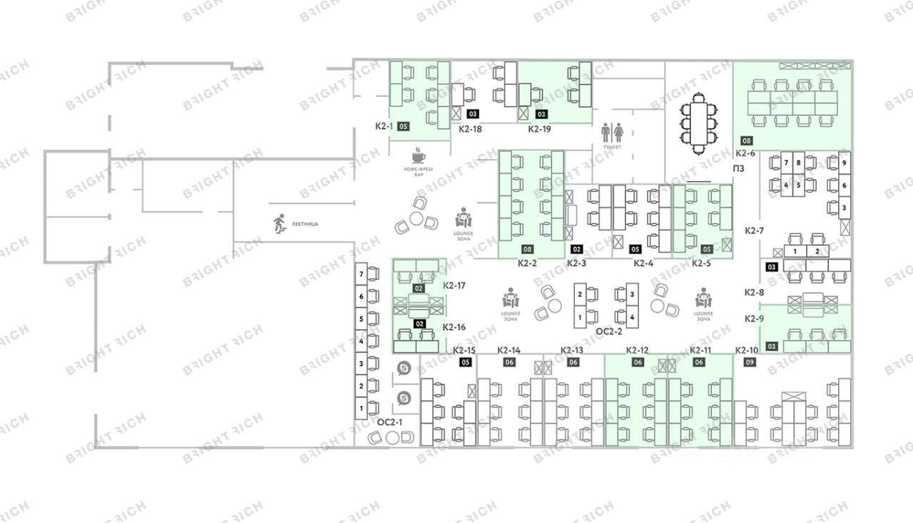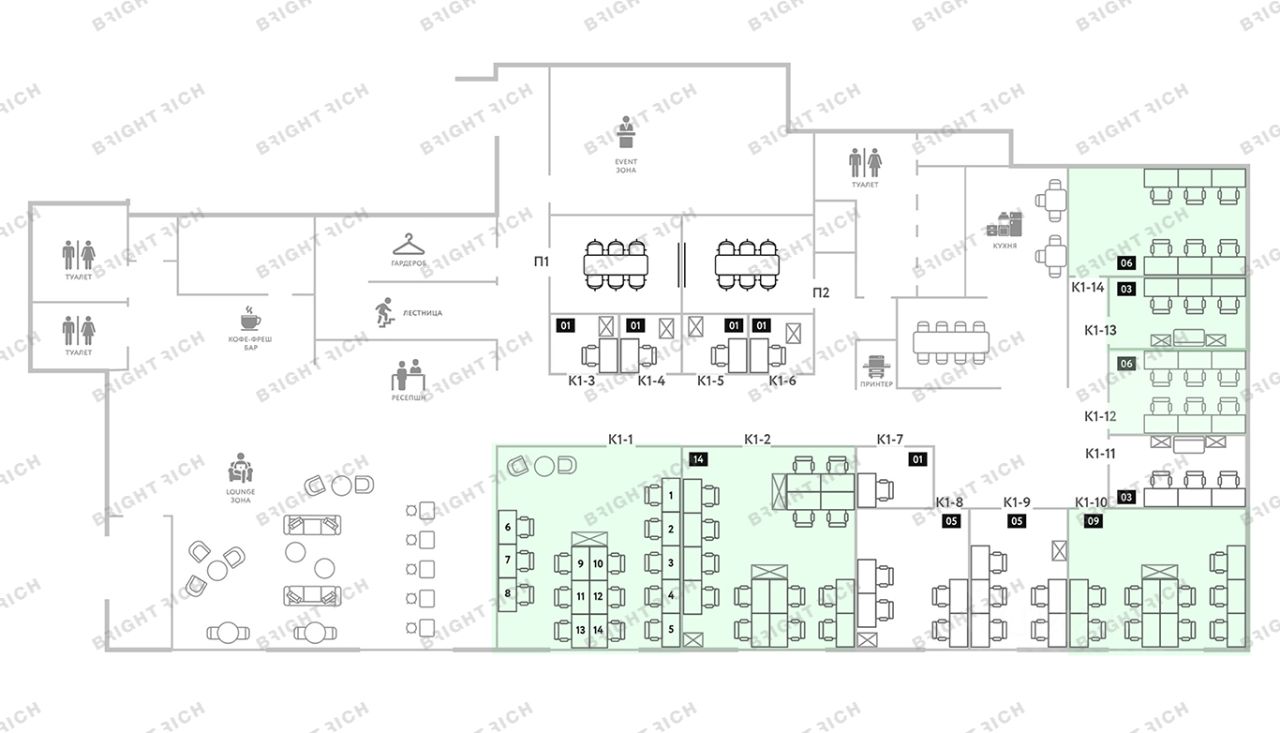 • Планировка: кабинеты; в общем доступе - оборудованная кухня, кофе-поинт, принтерная зона и зоны отдыха
