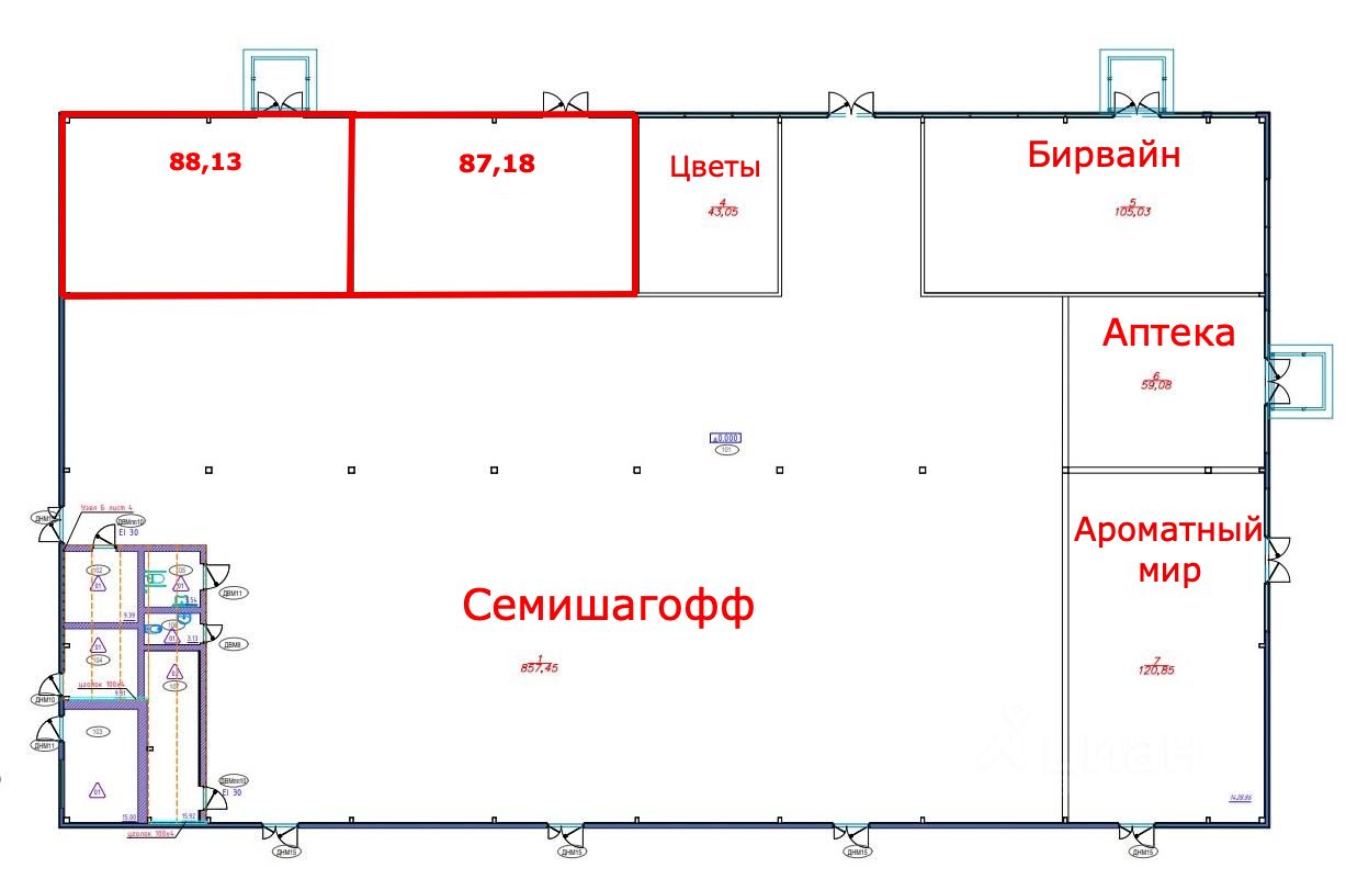 1. Торговая площадь 88,13 кв.м. и 87,18 кв.м. располагается в фасадной части здания.