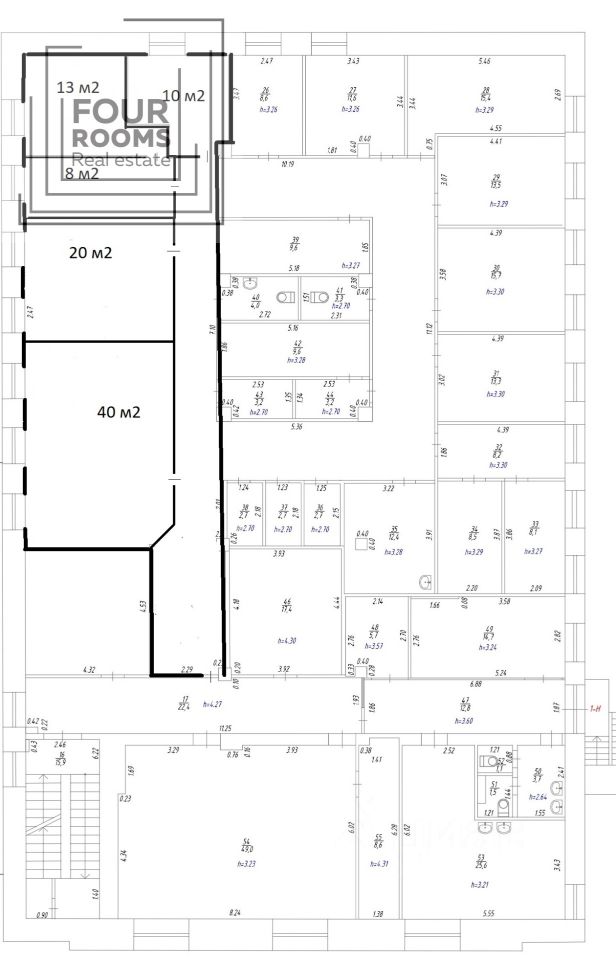 Возможна аренда нескольких помещений (13 м², 20 м², 40 м²) или целого блока 124 м².