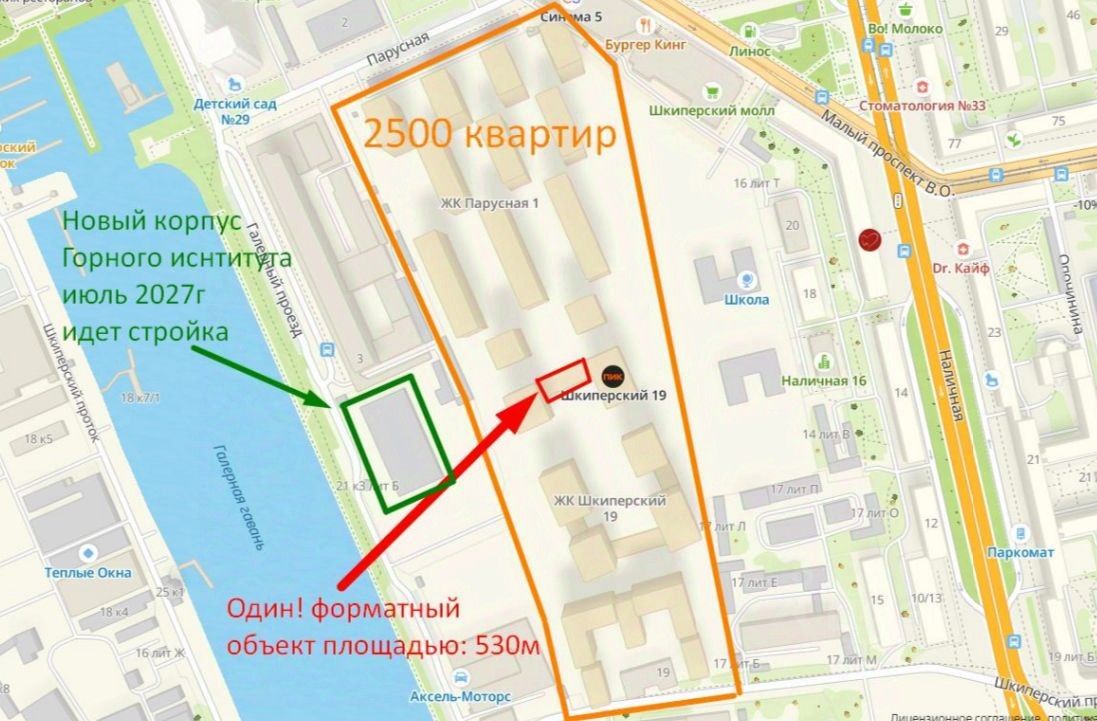 Помещение расположено в новом ЖК Шкиперский 19 в Приморском районе Санкт-Петербурга, ближайшая ст. метро Приморская.