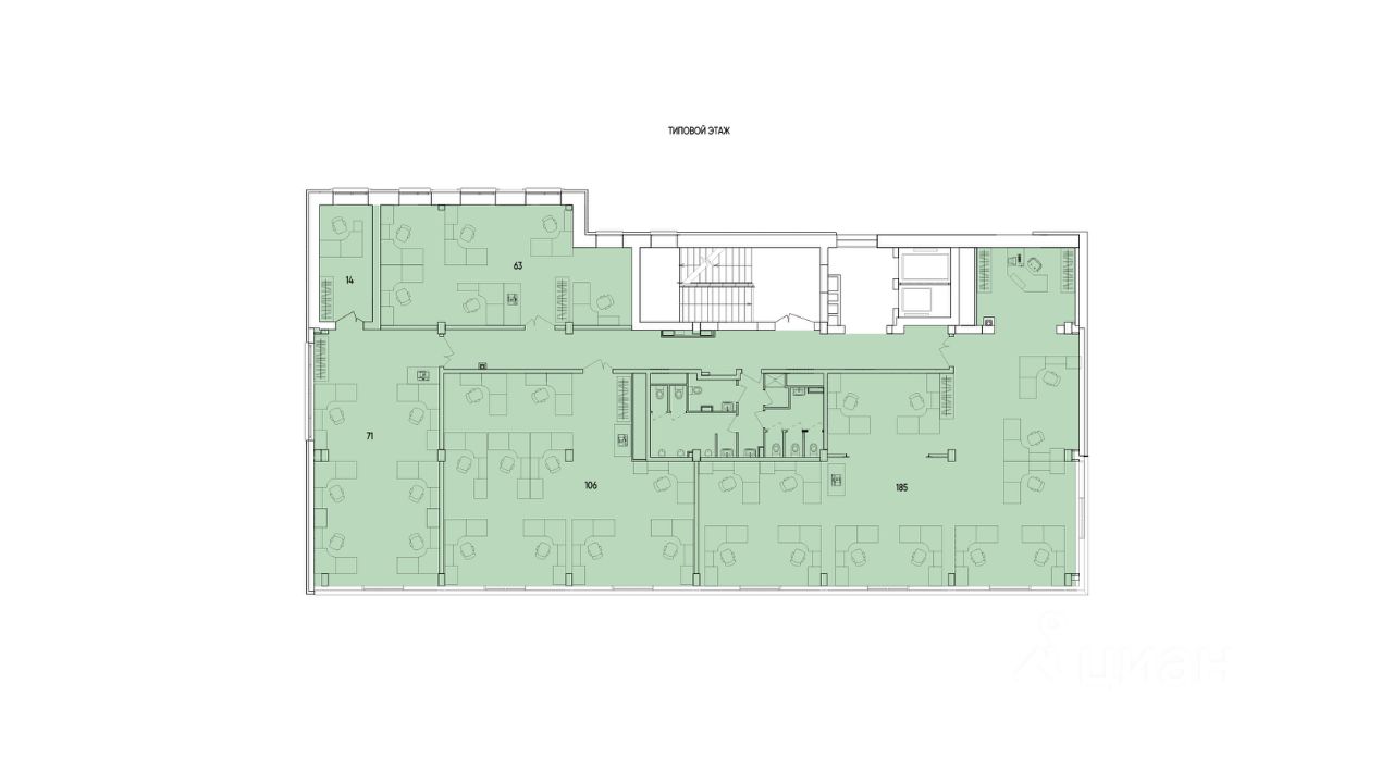 Помещение занимает полностью весь 5-й этаж, имеет индивидуальный вход из лифтового холла и служебной лестницы, а также индивидуальные санузлы. Планировкой предусмотрены 4-ре светлых просторных кабинета, площадью от 63 м² до 185 м² и кабинет руководителя, площадью 14 м². Помещение передается с полной чистовой отделкой высокого качества — под ключ.