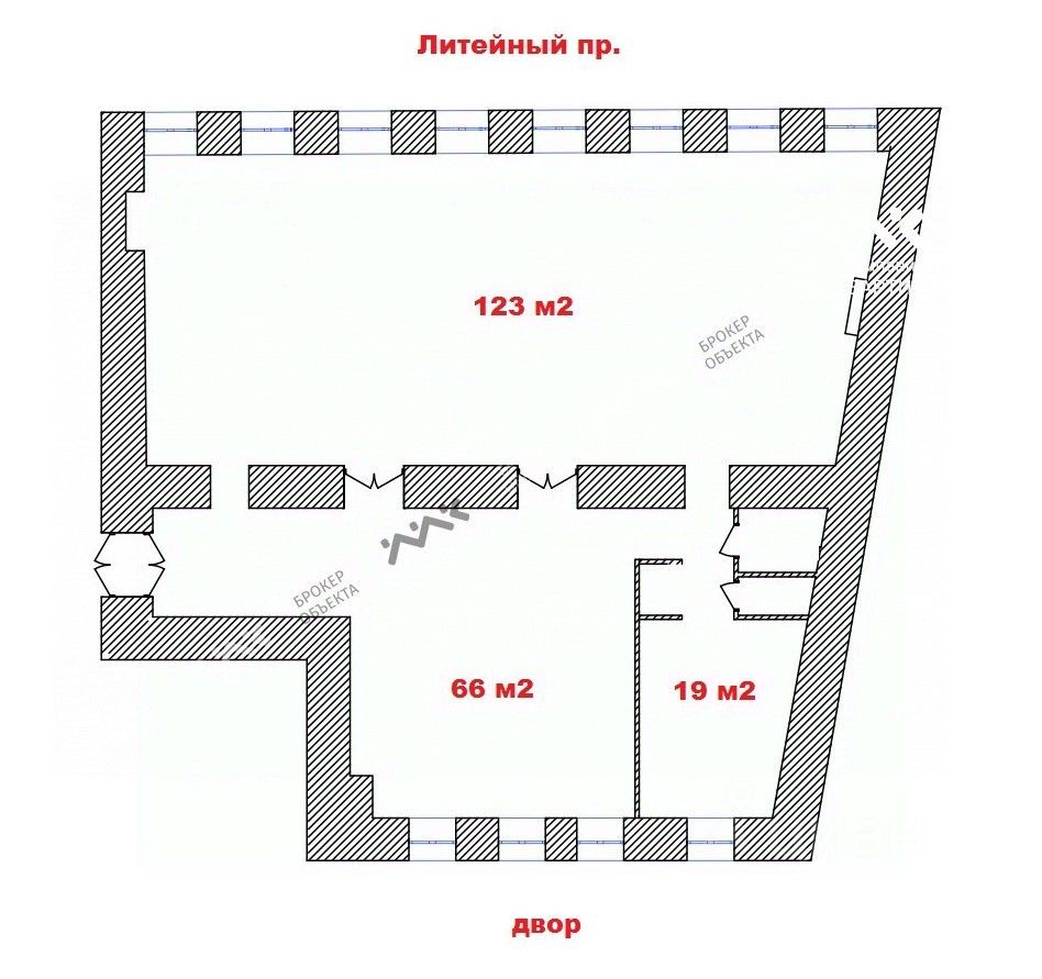 Один общий вход через парадную с Литейного проспекта, большое количество окон - 8 на Литейный проспект, 4 - во двор.