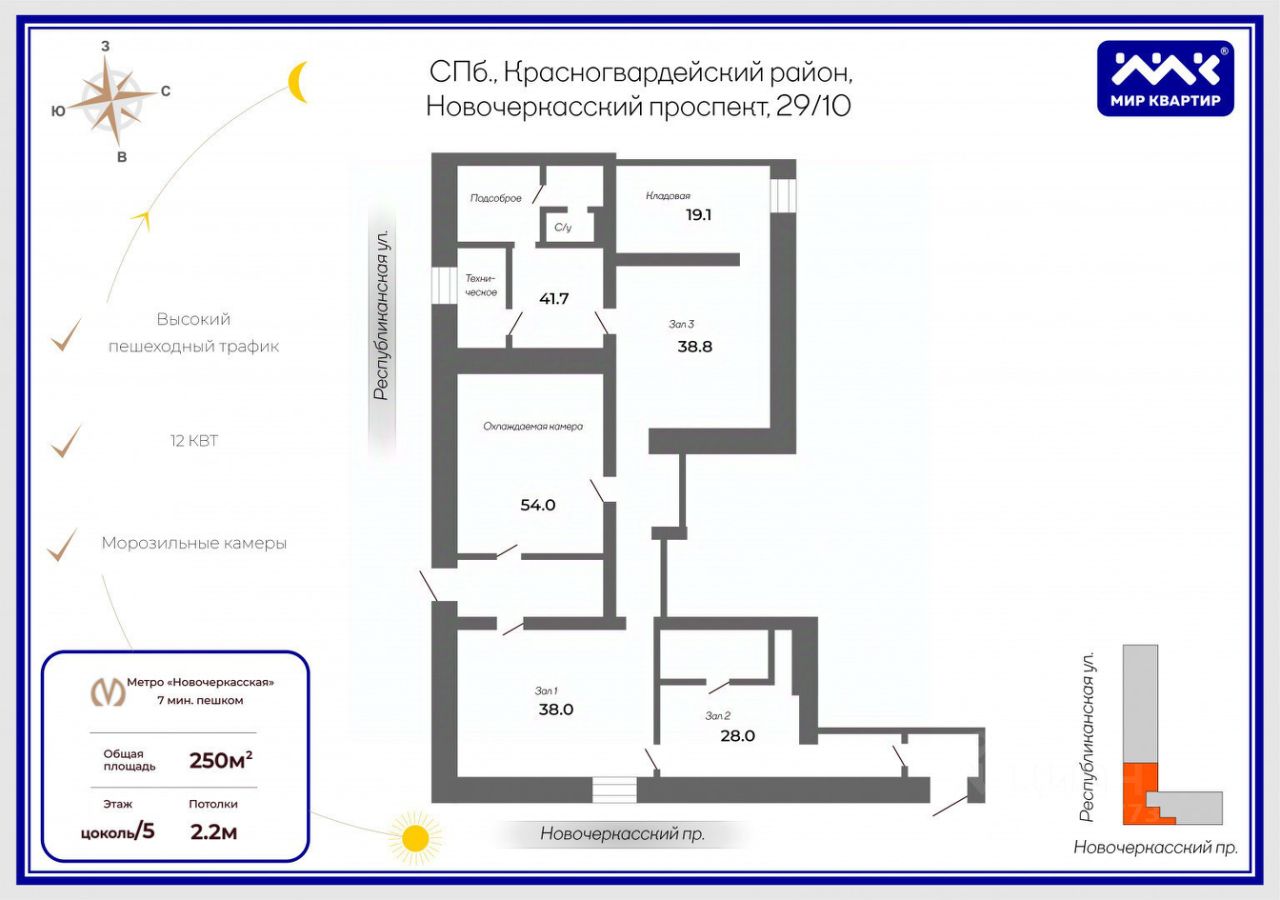 Отличное расположение - на углу оживленного перекрестка Новочеркасского проспекта и улицы Республиканской, благодаря чему, здесь отличный пешеходный трафик, в пешей доступности станция метро "Новочеркасская", рядом остановки общественного транспорта.