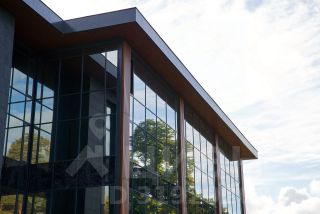 - Фасадное панорамное остекление с облицовкой камнем;