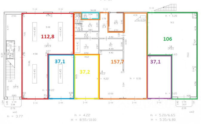 Площадь предлагаемая в аренду: 157,7 кв.м.(на плане выделено оранжевым)