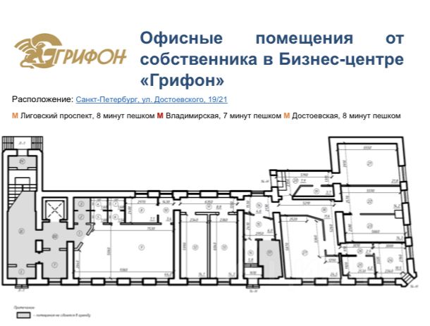 Бизнес-Центр Грифон находится по адресу Санкт-Петербург, улица Достоевского, 19/21, расположен в шаговой доступности от метро Лиговский проспект, Владимирская, Достоевская.