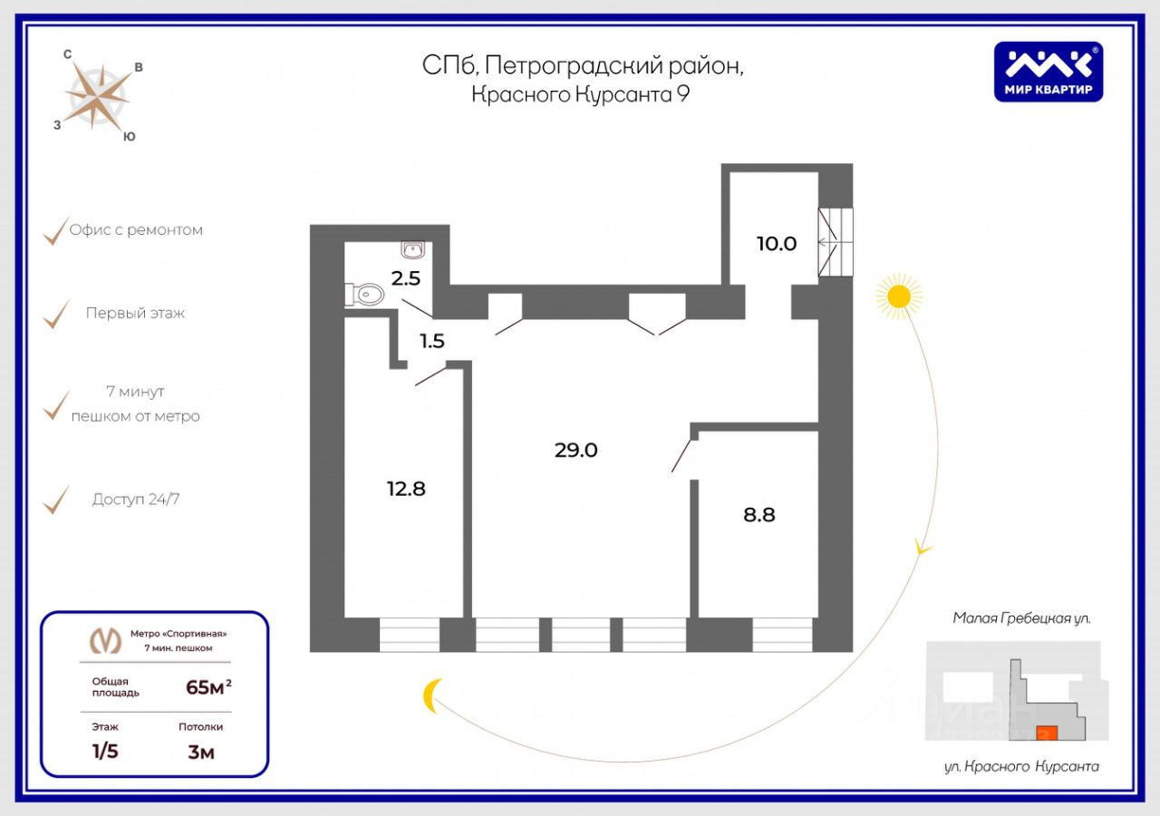 Предлагается в аренду помещение площадью 65 м2 в Петроградском районе на улице Красного Курсанта 9А. Первый этаж. ОТДЕЛЬНЫЙ ВХОД С УЛ. МАЛАЯ ГРЕБЕЦКАЯ С АРКИ (видно с улицы). Отличное состояние. Зал, кабинет руководителя, кухня и с\у.. Высота потолка 3м. Пять окон на улицу. Охранная сигнализация. Парковка на улице. Возможно разместить рекламу на фасаде. Коммунальные услуги оплачиваются отдельно.
