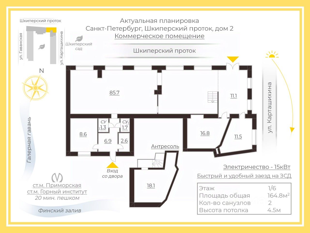 Площадь помещения 164,8 м2, включает площадь антресоли 18,1м2.